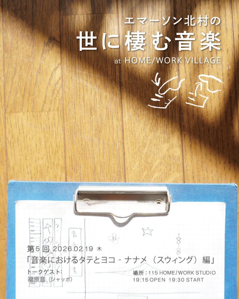 今回は日本各地だけでなく韓国や台湾など様々な街でエマーソン北村と演奏を共にしているVIDEOTAPEMUSICがトークゲスト兼DJとして参加。フィールドワークやライブ活動、映像制作を交差させながら独自の活動を続けるVIDEOTAPEMUSICと共にテーマである「街のグルーヴ」について考えてみます。会場は東京都福生市のブックカフェのCHA CHA CHA BOOKS。米軍横田基地があることで知られる福生。戦後に様々な文化が交差しながら独自の音楽文化やグルーヴを生み出してきた街でもあります。自分自身の内にあるものと外にあるもの、それがどのように混ざり合い音楽は生まれるのか。福生の街並みやCHA CHA CHA BOOKSのムードも感じながらぜひ楽しんでください。